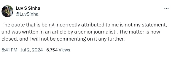 "The quote that is being incorrectly attributed to me is not my statement, and was written in an article by a senior journalist. The matter is now closed, and I will not be commenting on it any further," he wrote on X.
