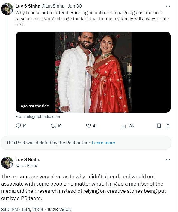 Sonakshi Sinha and Zaheer Iqbal have been all over the news ever since they got married, and one of the reasons is the absence of the actress' brother Luv Sinha at the wedding. Amid reports of rift between the siblings, Luv had shared a post about Zaheer's father and his links with a politician, but looks like he has now deleted the post.