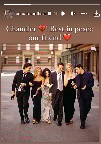 Actor Nimrat Kaur akso took to X (formerly Twitter) to share a picture of Matthew Perry. She tagged the image with the message, "Rest in glory #MatthewPerry. Chandler Bing for life," along with a broken heart emoji.