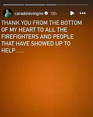 Hours later, Delevingne, shared a video that showed a street full of fire trucks with lights flashing. "Thank you from the bottom of my heart to all the firefighters and people that have showed up to help," another Instagram story read.