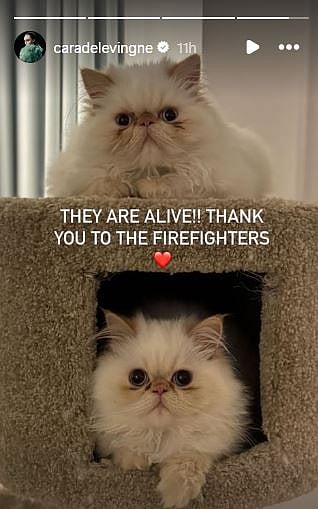 A third Instagram story showed a photo of two cats with the caption, "My heart is broken today I cannot believe it life can change in the blink of an eye cherish what you have." She later clarified with another post that her cats were not hurt in the fire.