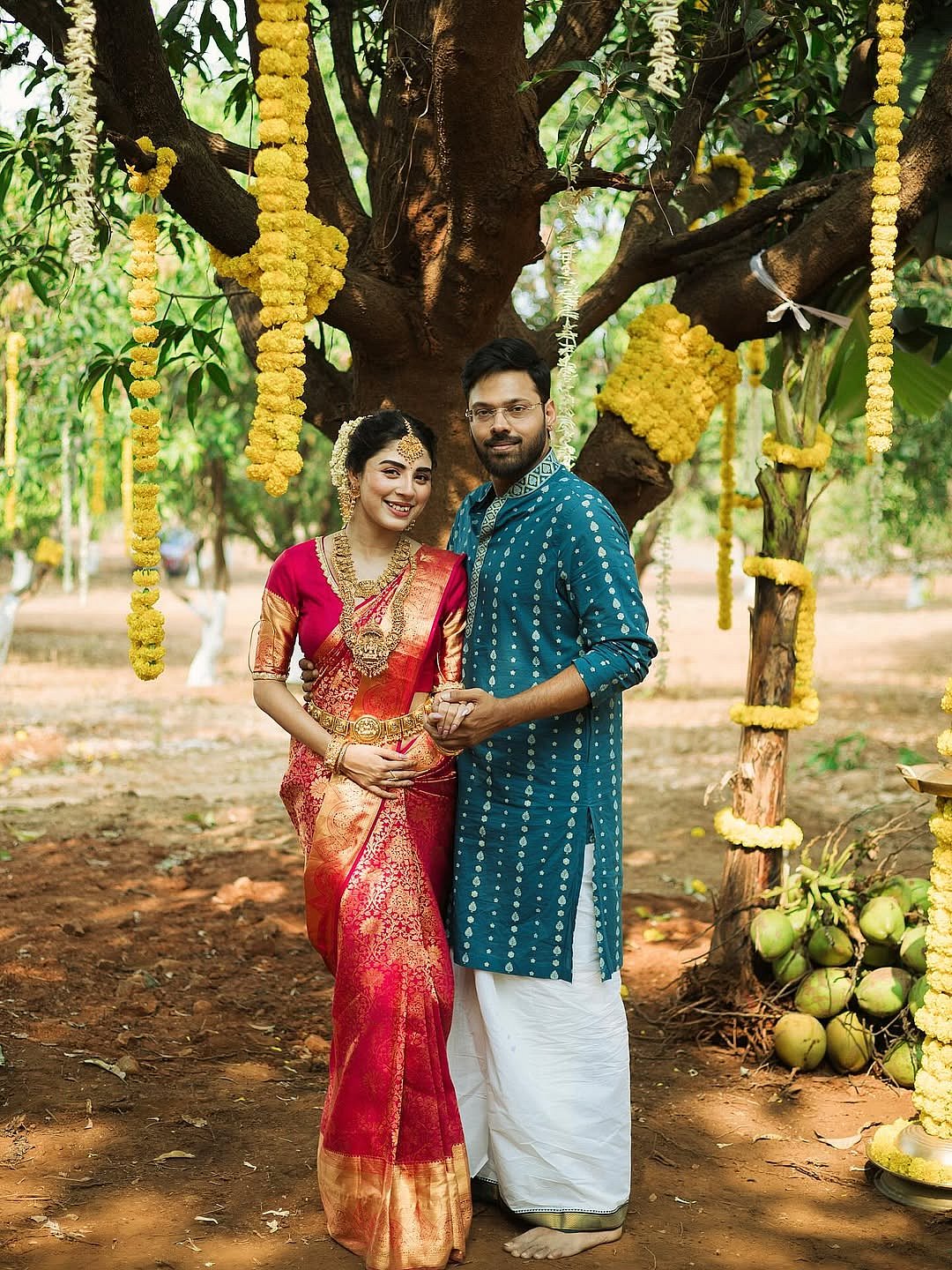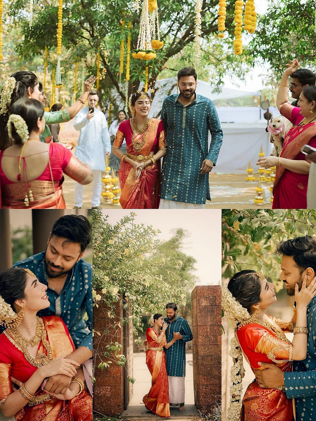 Adrija Roy and Vigunesh Iyer reportedly got engaged on January 25, 2026, at Vigunesh’s farmhouse. Adrija looked stunning in a red traditional South Indian saree, accessorized with a gold necklace, layered earrings, bangles, kamarband, maang-tika, and gajra. Vigunesh complemented her in a turquoise kurta paired with a white dhoti. The duo skipped traditional matching outfits and instead chose contrasting ensembles, adding a vibrant splash of color to their ceremony.
