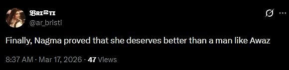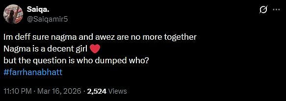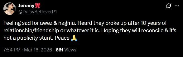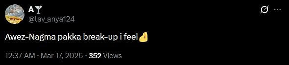 Another X user wrote, "Feeling sad for awez & nagma. Heard they broke up after 10 years of relationship/friendship or whatever it is. Hoping they will reconcile & it's not a publicity stunt. Peace (sic)."