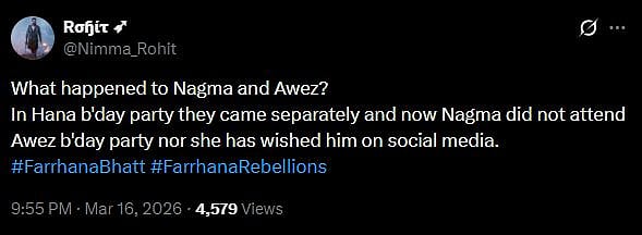 A netizen tweeted, "What happened to Nagma and Awez? In Hana b'day party they came separately and now Nagma did not attend Awez b'day party nor she has wished him on social media (sic)."