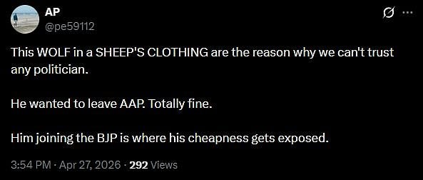 Well, once again, the actor's tweet is getting a mixed response from netizen. An X user wrote, "This WOLF in a SHEEP'S CLOTHING are the reason why we can't trust any politician. He wanted to leave AAP. Totally fine. Him joining the BJP is where his cheapness gets exposed (sic)."
