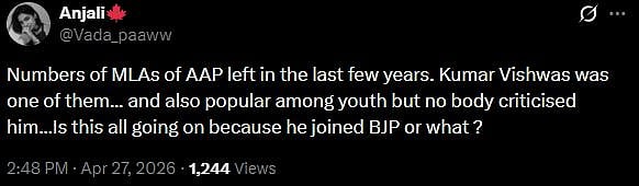 Another X user wrote, "Numbers of MLAs of AAP left in the last few years. Kumar Vishwas was one of them... and also popular among youth but no body criticised him...Is this all going on because he joined BJP or what? (sic)." Check out the tweets below...