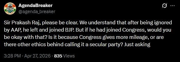 Another netizen tweeted, "Sir Prakash Raj, please be clear. We understand that after being ignored by AAP, he left and joined BJP. But if he had joined Congress, would you be okay with that? Is it because Congress gives more mileage, or are there other ethics behind calling it a secular party? Just asking (sic)."