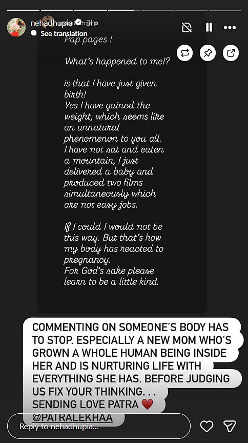Resharing her post on her Instagram story on Friday, Neha wrote, "Commenting on someone's body has to stop. Especially a new mom who's grown a whole human being inside her and is nurturing life with everything she has. Before judging us fix your own thinking. Sending love Patra. (sic)"