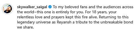 In another post, the actor shared a message for his fans and the audience, and wrote, "To my beloved fans and the audiences across the world, this one is entirely for you. For 18 years, your relentless love and prayers kept this fire alive. Returning to this legendary universe as Reyansh, a tribute to the unbreakable bond we share."