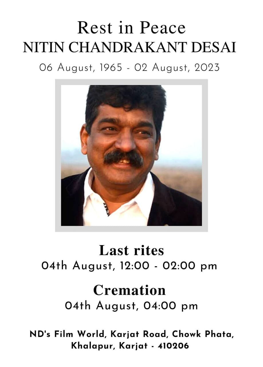 According to relatives, the body of Desai has been kept in the mortuary in Mumbai and will be taken to ND Studio on Friday for the last rites. It is learned that Desai left a note in which he expressed his wish for his last rites to be performed at the studio premises. Studio employees confirmed that the funeral will be held at ground number six in the studio.