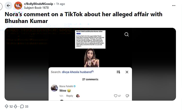 A Reddit thread recently went viral after Nora once again stirred rumours about her alleged affair with Bhushan Kumar. An influencer shared a three-year-old Reddit thread discussing the alleged affair, in which the actress had replied with a comment, "Wow (laughing emoji)." A user took a screenshot of her comment and posted it on Reddit with the title, "Nora’s comment on a TikTok about her alleged affair with Bhushan Kumar." One user reacted, "Lmfao why did she even comment now it's gonna bring more eyeballs, not her setting herself up," while another joked, "Don’t lie Nora."