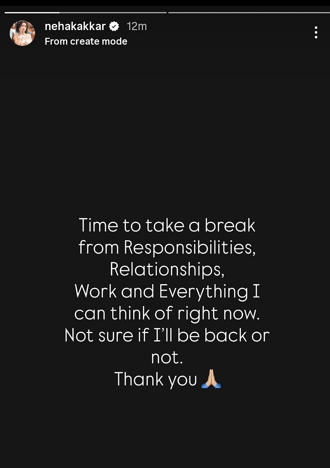 In her first story, Neha hinted at stepping away from multiple aspects of her life, including work and personal commitments. “Time to take a break from responsibilities, relationships, work and everything I can think of right now. Not sure if I’ll be back or not. Thank you,” she wrote.