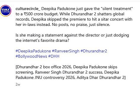 A couple of weeks ago, a social media account shared a reel questioning Deepika's silence on the film. The caption of the reel read, "Deepika Padukone just gave the "silent treatment" to a ₹500 crore budget. While Dhurandhar 2 shatters global records, Deepika skipped the premiere to hit a sitar concert with her in-laws instead. No posts, no praise, just silence. Is she making a statement against the director or just dodging the internet’s favorite drama? (sic)."