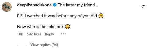 Replying to the reel, Deepika commented, "The latter my friend… P.S. I watched it way before any of you did đŸ˜‰ Now who is the joke on? (sic)." Check out comment below...