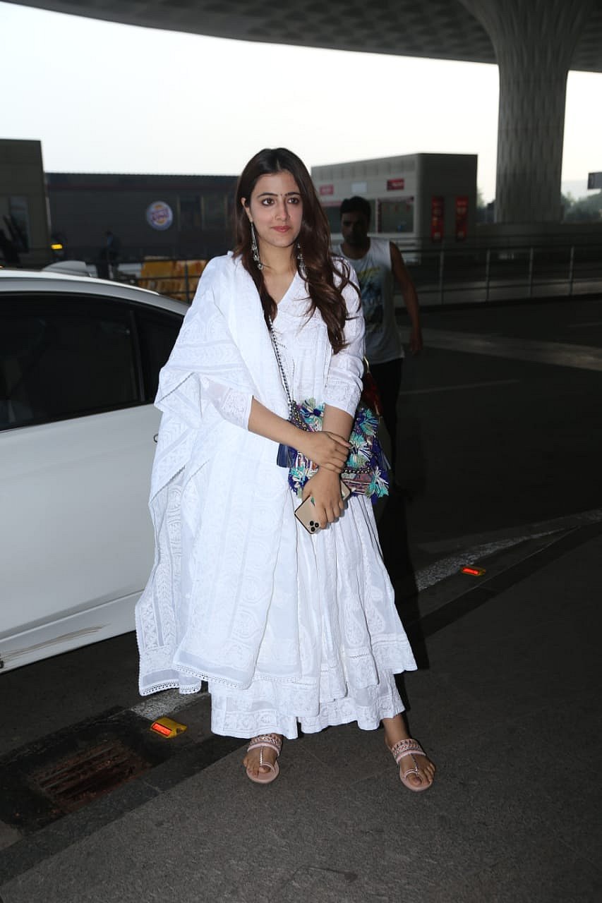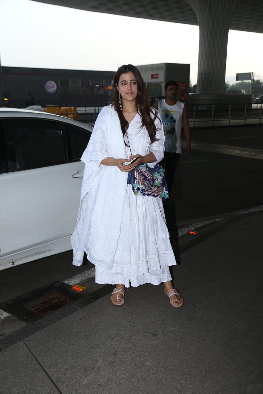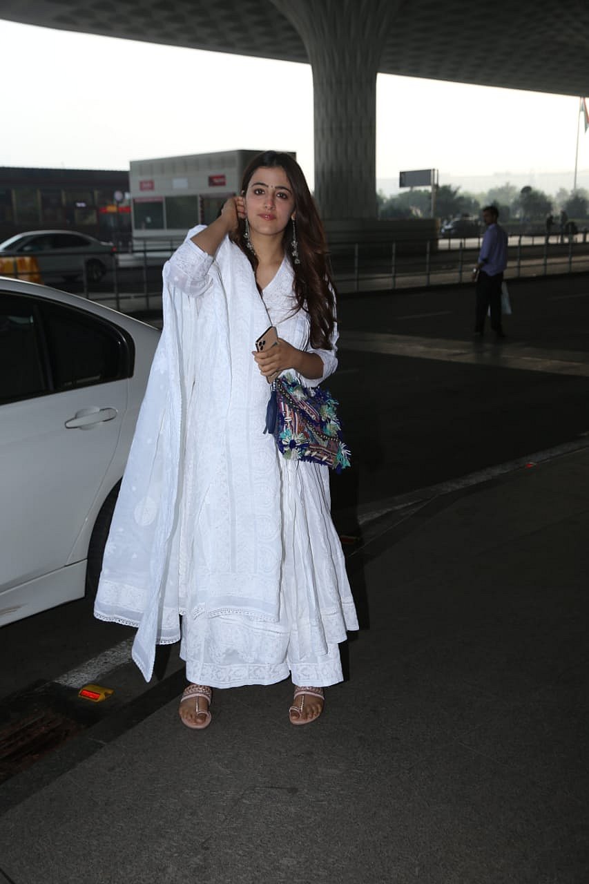 Basking into the success of her first ever music video, the star sibling was spotted by paparazzi at the airport today. Clad in a pristine white anarkali suit, Nupur made heads turn in her traditional avatar. She accessorized her look with a quirky blue sling bag.