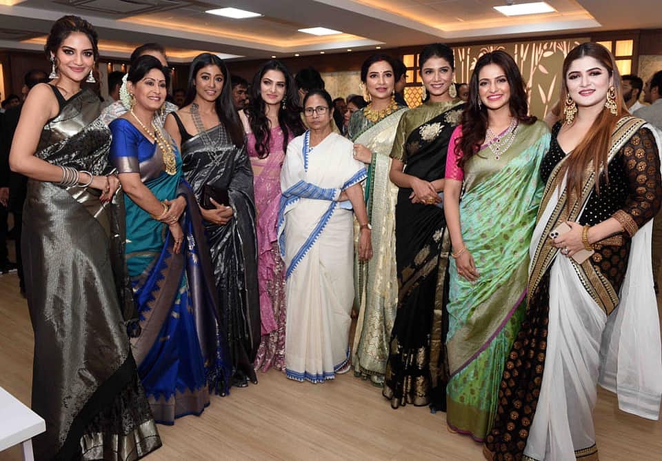Flanked by yesteryear's top heroine Rakhi Gulzar, West Bengal Chief Minister Mamata Banerjee and 'thali girl' Srabonti Chatterjee, Roopa Ganguly, the actress turned politician Nusrat Jahan and Mimi Chakraborty, SRK lit the ceremonial lamp to wild cheers from the audience.