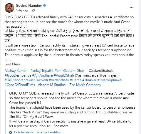 Govind Namdev, who essays the role of a pujari in OMG 2, took to his official Facebook account a couple of days back and called the film 'thoughtful' and 'progressive'. He also added that it has been made for teenagers and said that the CBFC should have granted UA certification to the film.