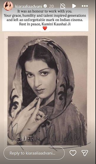 Kiara Advani also posted, "It was an honour to work with you. Your grace, humility, and talent inspired generations and left an unforgettable mark on Indian cinema. Rest in peace, Kamini Kaushal ji (sic)."