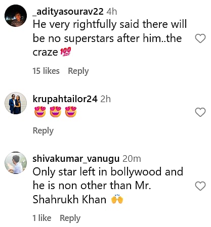 Another Instagram user wrote, “He very rightfully said there will be no superstars after him..the craze (sic).” One more netizen commented, “Only star left in bollywood and he is non other than Mr. Shahrukh Khan (sic).” Check out the comments below…