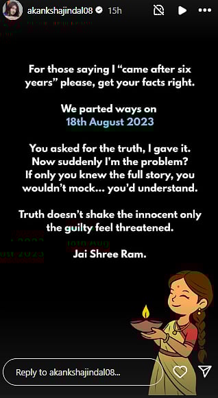 Taking to her Instagram story on Sunday evening, October 26, Akanksha wrote, "For those saying I ‘came after six years’—please’, get your facts right. We parted ways on August 18, 2023. You asked for the truth, I gave it. Now suddenly I’m the problem? If only you knew the full story, you wouldn’t mock… you’d understand. Truth doesn’t shake the innocent — only the guilty feel threatened."