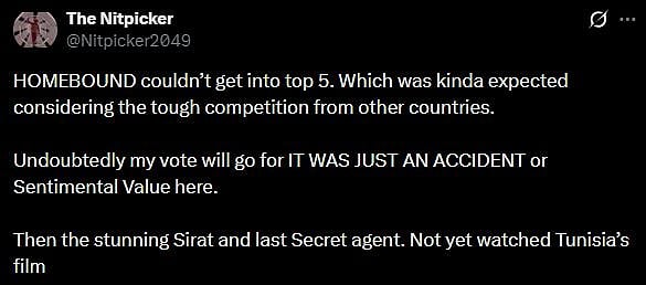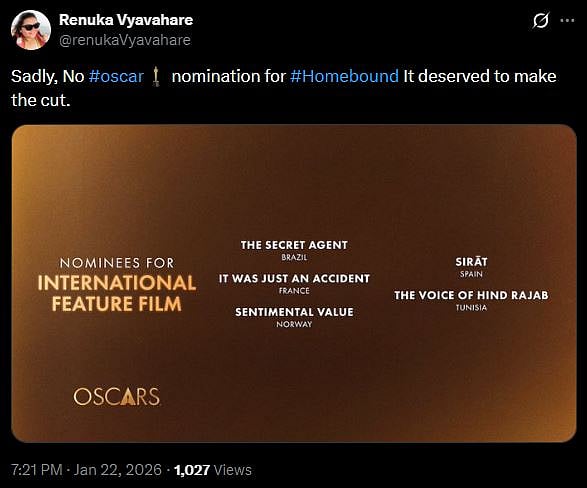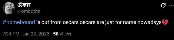 Another X user wrote, "#homebound is out from oscars oscars are just for name nowadays (sic)." One more netizen tweeted, "Ughh why can’t good stories ever get the recognition they deserve in their own time but if you haven’t already do watch Homebound Oscar or not, more such stories deserve center stage and silver screens anyway (sic)." Check out the tweets below...