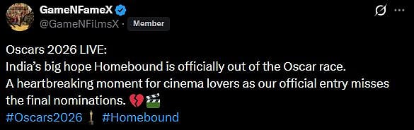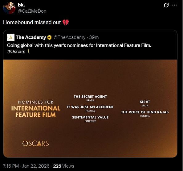 Well, netizens are quite sad as Homebound failed to get a nomination at the Oscars 2026. A netizen tweeted, "Oscars 2026 LIVE: India’s big hope Homebound is officially out of the Oscar race. A heartbreaking moment for cinema lovers as our official entry misses the final nominations (sic)."