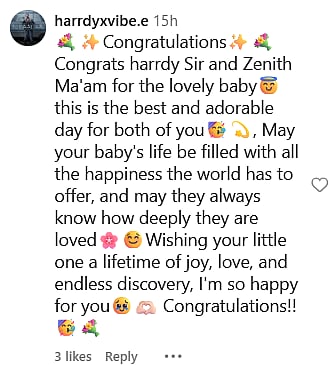 One more fan wrote, "Congratulations✨💐 Congrats harrdy Sir and Zenith Ma'am for the lovely baby😇this is the best and adorable day for both of you🥳💫, May your baby's life be filled with all the happiness the world has to offer, and may they always know how deeply they are loved🌸☺️Wishing your little one a lifetime of joy, love, and endless discovery, I'm so happy for you🥹🫶🏻 Congratulations!! (sic)." Check out the comments below...