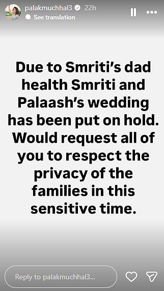 On Monday, Palash's sister and singer Palak Muchhal had shared on her Instagram story, "Due to Smriti's dad health Smriti and Palaash's wedding has been put on hold. Would request all of you to respect the privacy of the families in this sensitive time (sic)."