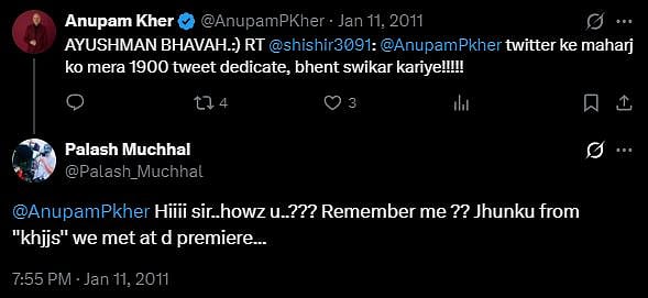 In 2011, he had also replied to one of the tweets of Anupam Kher. Palash tweeted, "@AnupamPkher Hiiii sir..howz u..??? Remember me ?? Jhunku from ''khjjs'' we met at d premiere... (sic)."