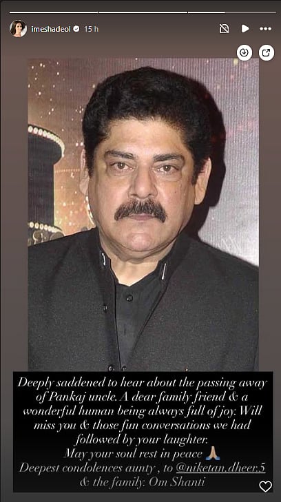 Esha Deol also shared a picture of Dheer on her Instagram story and wrote, "Deeply saddened to hear about the passing away of Pankaj uncle. A dear family friend & a wonderful human being always full of joy: Will miss you & those fun conversations we had followed by your laughter. May your soul rest in peace. Deepest condolences aunty, to @niketan.dheer.5 & the family. Om Shanti."