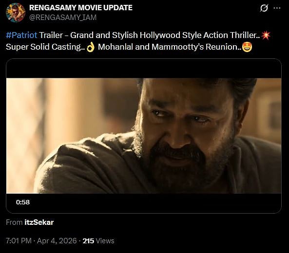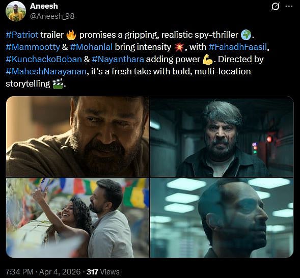 One more netizen tweeted, "#Patriot trailer π₯ promises a gripping, realistic spy-thriller π. #Mammootty & #Mohanlal bring intensity π₯, with #FahadhFaasil, #KunchackoBoban & #Nayanthara adding power πͺ. Directed by #MaheshNarayanan, itβs a fresh take with bold, multi-location storytelling (sic)." Check out the tweets below...