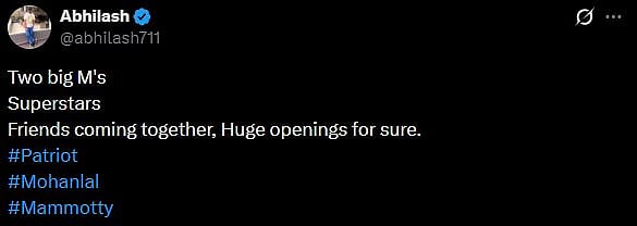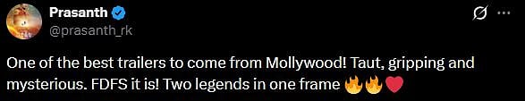 A netizen tweeted, "One of the best trailers to come from Mollywood! Taut, gripping and mysterious. FDFS it is! Two legends in one frame (sic)." Another X user wrote, "Two big M's. Superstars. Friends coming together, Huge openings for sure (sic)."
