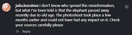 Reacting to Rupali's appeal after Chanchal's death, the photographer commented on PETA India's Instagram post and wrote, "I don’t know who spread this misinformation, but what I’ve been told is that the elephant passed away recently due to old age. The photoshoot took place a few months earlier and could not have had any impact on it. Check your sources carefully please."
