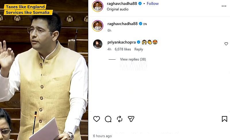 Aam Aadmi Party leader and Parineeti Chopra's husband, Raghav Chadha, was making it to the headlines because of his strong speeches in the Rajya Sabha. However, a couple of days ago, AAP removed him as the Deputy Leader of the party, and reportedly requested the Rajya Sabha Secretariat to not allot Chadha any speaking time from the party’s quota. Chadha has been sharing videos on Instagram after his demotion, and on Saturday, his sister-in-law, Priyanka Chopra reacted to one of his videos.