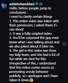 The influencer also added that the woman seen in the video was part of his Italy team. Ashish ended his note by saying, "I understand that this video comes across as promoting unruly behavior publicly, so i apologize and i have taken it down." Despite the clarity, people continued to troll the influencer in the comment section, saying, "Jab influencers hi aisa hain followers ki baat toh bhul hi jao."