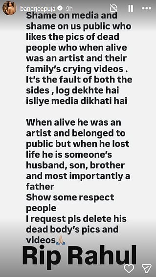 She added, "Show some respect, people. I request pls delete his dead body's pics and videos." Puja ended the post with ‘RIP Rahul.”