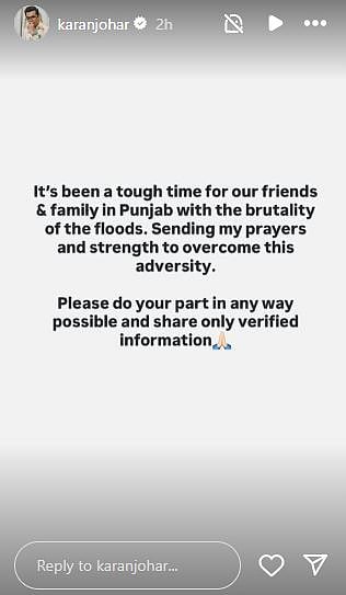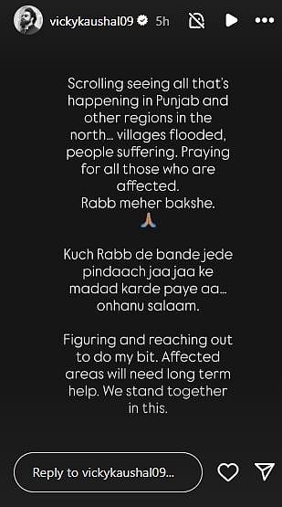 Vicky Kaushal posted on his Instagram story, "Scrolling seeing all that's happening in Punjab and other regions in the north... villages flooded, people suffering. Praying for all those who are affected. Rabb meher bakshe. Kuch Rabb de bande jede pindaach jaa jaa ke madad karde paye aa... onhanu salaam. Figuring and reaching out to do my bit. Affected areas will need long term help. We stand together in this."