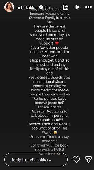 "Ab se I'm Not going to talk about my personal life bhaisahab!!!! Bechari Emotional Nehu is too Emotional for This World! Sorry and Thank you My NeHearts Don't worry, I'll be back soon with a BANG! Much love! (sic)," she further wrote.