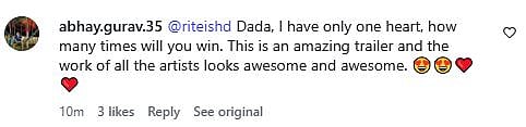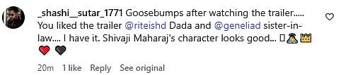 Another Instagram user wrote, "Goosebumps after watching the trailer..... Liked the trailer @riteishd Dada and @geneliad sister-in-law.... I have it. Shivaji Maharaj's character looks good... (sic)."