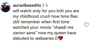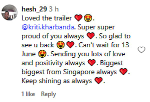 Another Instagram user commented, “Loved the trailer. @kriti.kharbanda. Super super proud of you always. So glad to see u back. Can't wait for 13 June. Sending you lots of love and positivity always. Biggest biggest from Singapore always. Keep shining as always (sic).”