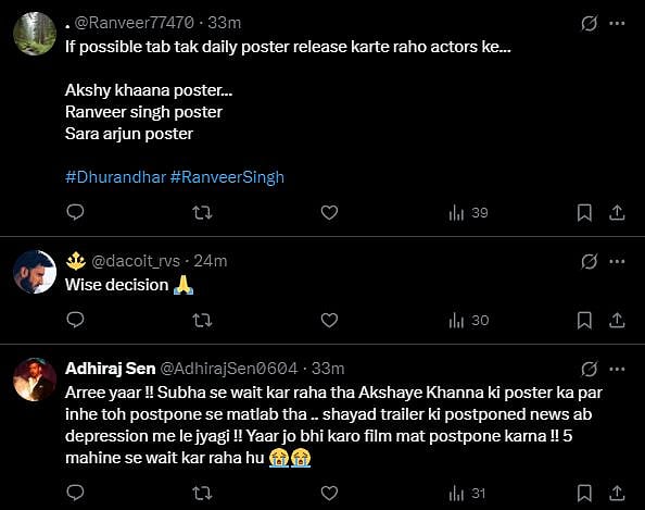 A netizen tweeted, "If possible tab tak daily poster release karte raho actors ke... Akshy khaana poster... Ranveer singh poster Sara arjun poster (sic)." Another X user wrote, "Wise decision (sic)."