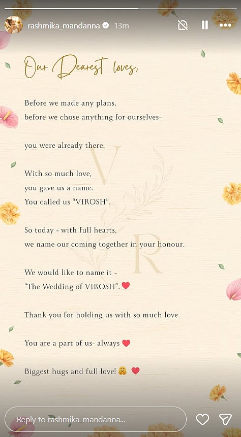 In a joint note addressed to their fans, the couple wrote, "Our Dearest loves, before we made any plans, before we chose anything for ourselves - you were already there. With so much love, you gave us a name. You called us ‘VIROSH’. So today, with full hearts, we name our coming together in your honour. We would like to name it - ‘The Wedding of VIROSH’. Thank you for holding us with so much love. You are a part of us - always. Biggest hugs and full love."