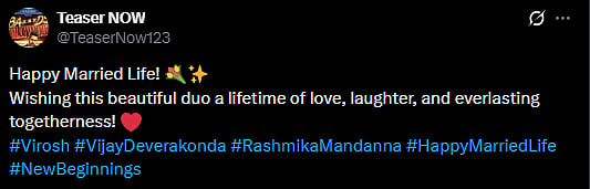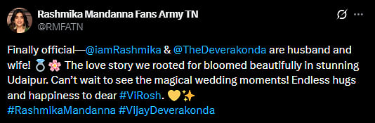Another X user wrote, "Finally official— @iamRashmika & @TheDeverakonda are husband and wife! 💍🌸 The love story we rooted for bloomed beautifully in stunning Udaipur. Can’t wait to see the magical wedding moments! Endless hugs and happiness to dear #ViRosh (sic)."
