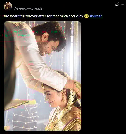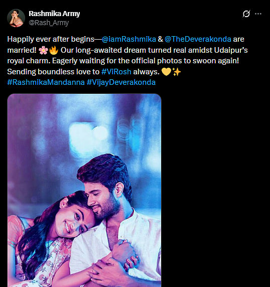 A fan tweeted, "Happily ever after begins— @iamRashmika & @TheDeverakonda are married! 🌸🔥 Our long-awaited dream turned real amidst Udaipur’s royal charm. Eagerly waiting for the official photos to swoon again! Sending boundless love to #ViRosh always (sic)."