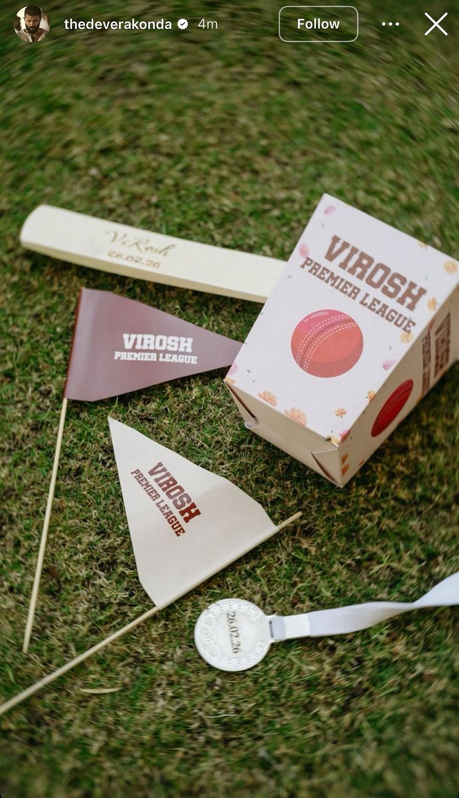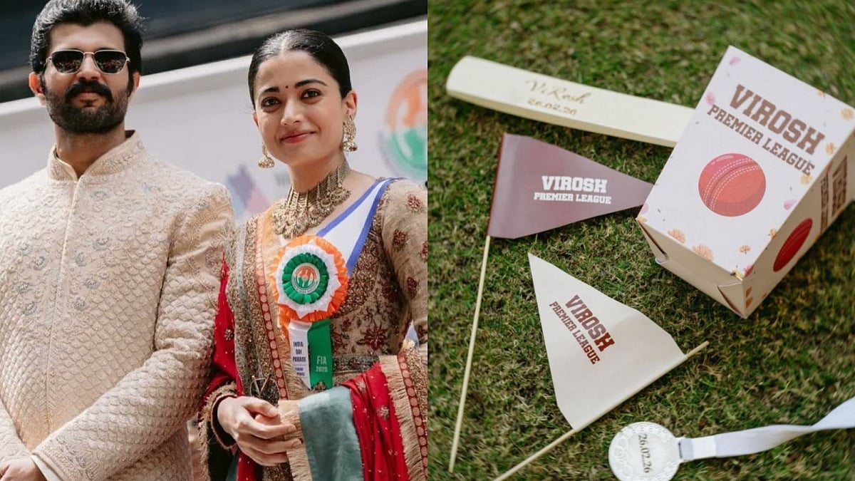 On day two, the soon-to-be married couple turned up the fun quotient by hosting a friendly cricket match with their close friends and relatives, aptly titled the 'Virosh Premier League,' where they playfully competed against each other. On Tuesday, Vijay and Rashmika offered a glimpse into the match, showcasing a cream-coloured wooden bat engraved with 'VIROSH' and their wedding date, 26.02.26, along with a decorative box labelled 'VIROSH PREMIER LEAGUE' featuring a red cricket ball graphic.