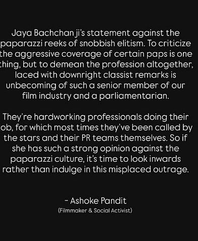 Following her comments, filmmaker Ashoke Pandit criticised Jaya Bachchan, accusing her of demeaning the paparazzi and their profession. In a long statement, he wrote, "Jaya Bachchan ji's statement against the paparazzi reeks of snobbish elitism. To criticise the aggressive coverage of certain paps is one thing, but to demean the profession altogether, laced with downright classist remarks, is unbecoming of such a senior member of our film industry and a parliamentarian."