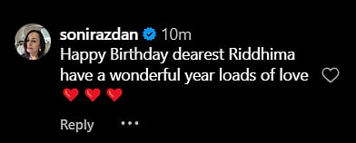 As soon as Neetu dropped the video on social media. Several celebrities reacted to the celebration and wished Riddhima on her birthday. Soni Razdhan wrote, "Happy Birthday, dearest Riddhimma Have a wonderful year, loads of love."