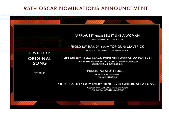 The song will compete with other tracks including 'Applause' from 'Tell It Like a Woman', 'Hold mY hand' from 'Top Gun: Maverick', 'Lift Me Up' from 'Black Panther: Wakanda Forever' and 'This Is A Life' from 'Everything Everywhere All At Once'.