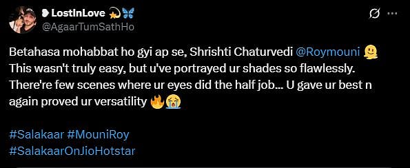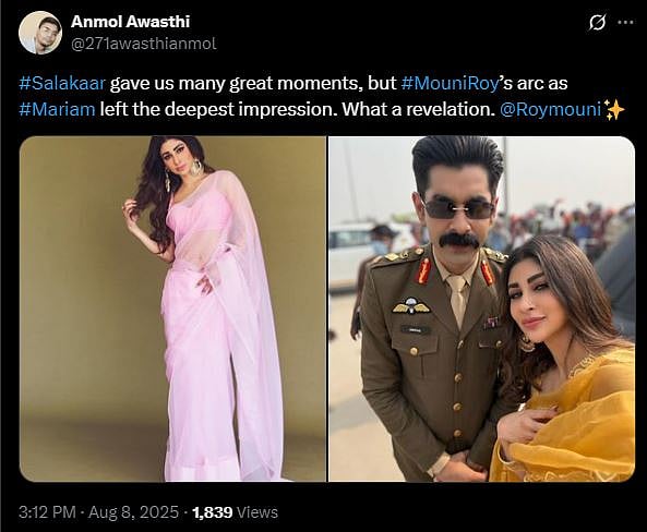 Another X user wrote, "#Salakaar gave us many great moments, but #MouniRoy’s arc as #Mariam left the deepest impression. What a revelation (sic)."
