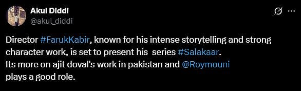 One more netizen tweeted, "Director #FarukKabir, known for his intense storytelling and strong character work, is set to present his series #Salakaar. Its more on ajit doval's work in pakistan and @Roymouni plays a good role (sic)." Check out the tweets below...